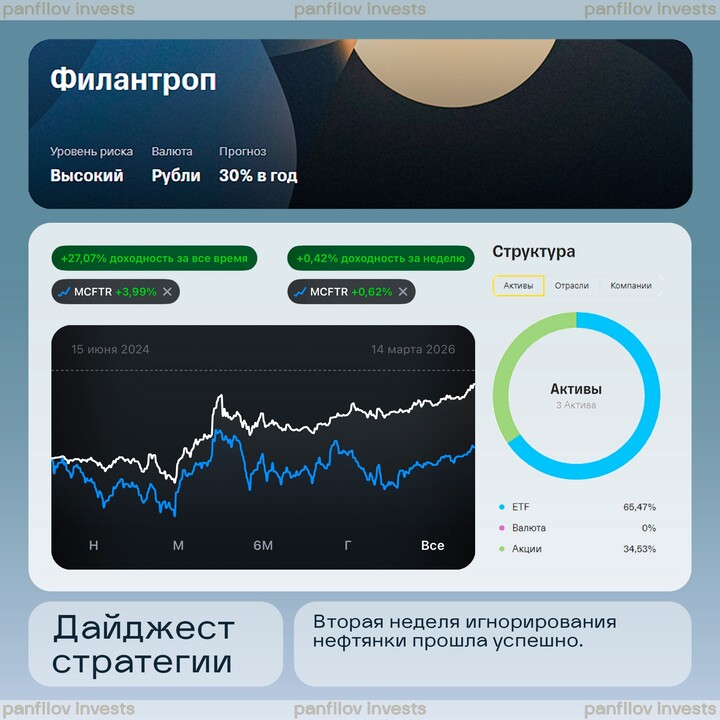 Хорошая неделька для стратегии [&Филантроп](https://www.tbank.ru/invest/strategies/c4896e28-692b-4f93-88e2-9b2c447d1d45) , которая до самого закрытия держалась лучше рынка, хоть и чуть-чуть отстала под конец.