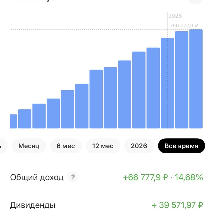 Портфель в 2026 году вырос вырос примерно на 12,7 тыс рублей, до 307 тыс. Причём 7 тыс получил дивидендами и купонами. А за 12 месяцев - 32,5 тыс рублей.